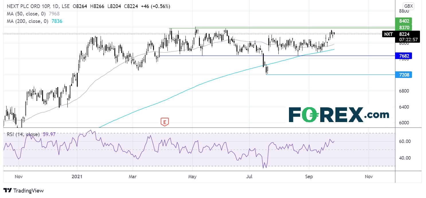 在本月早些时候自200均线反弹后,Next股价继续上涨攻向上轨8360便士。