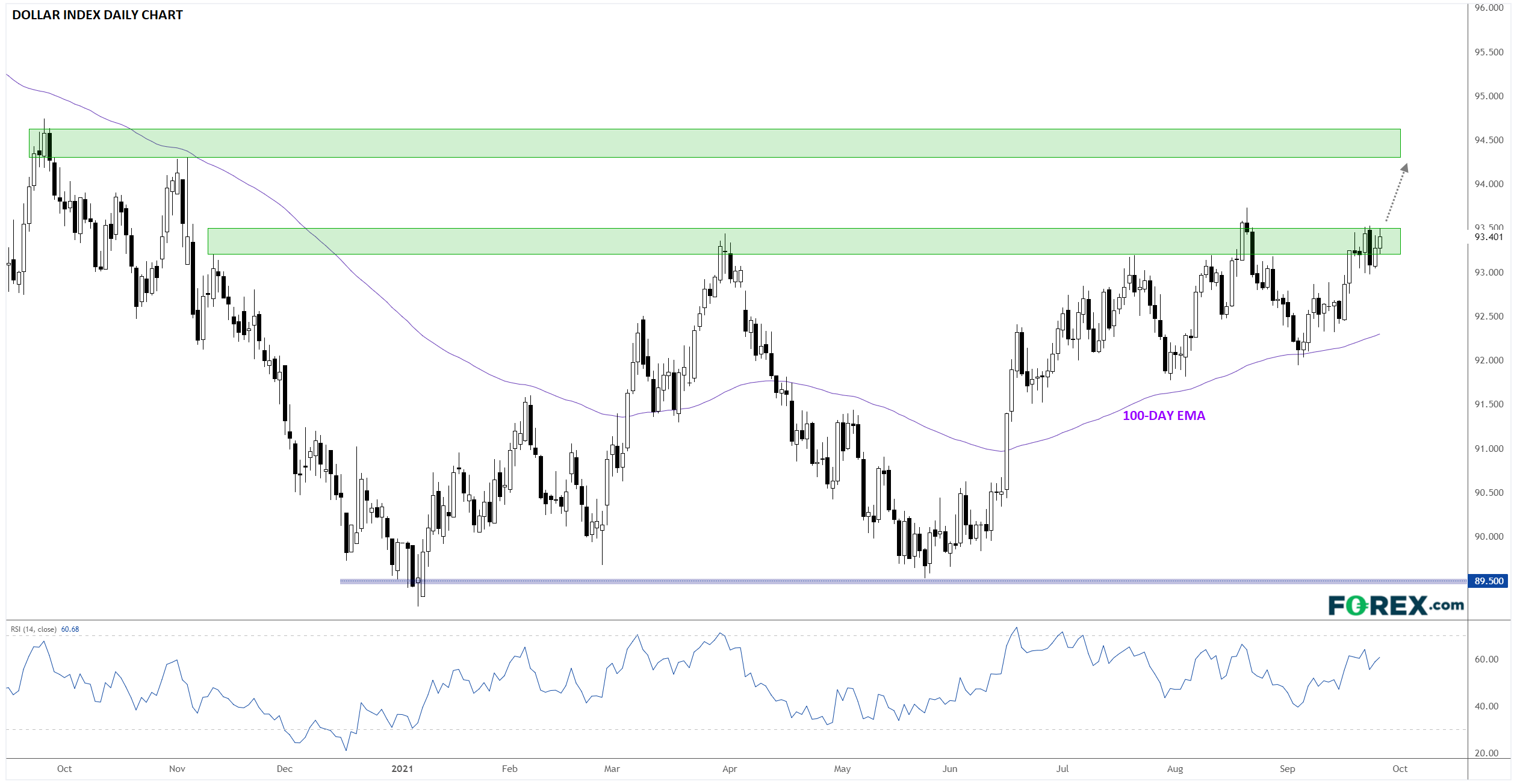 不出意外,鉴于两年期美债收益率和美元的密切相关,美元成为本月迄今最强主要货币。在9月初回落至100天EMA均线之后,美元指数再次即将突破前阻力93.20-50区域,攻向今年迄今最高水平: