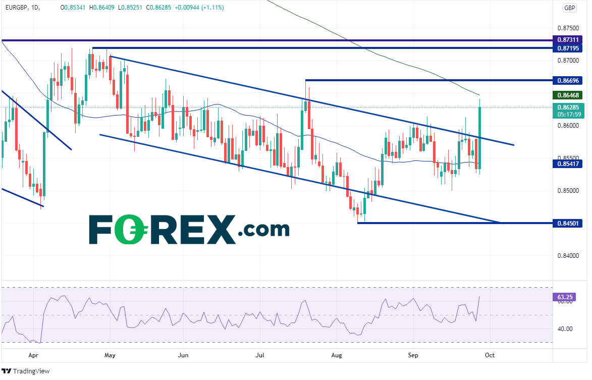 英镑不只是兑美元下跌。欧元/英镑4月26日在0.8719附近形成高点后有序下跌并形成通道,周一收在通道中轨且低于0.8541附近的50天均线所在。但周二在英镑走弱的带动下大举上攻,攻克通道下降的上轨趋势线,目前测试200天均线所在的0.8647。该位往上的阻力有水平阻力位0.8670、4月26日高点0.8719。盘中支撑位在9月2日高点0.8613、周一高点以及通道上轨趋势线0.8579附近、50天均线0.8541。