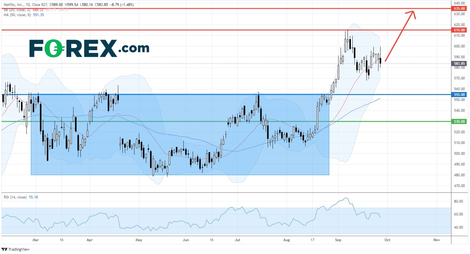 从日线图上看,网飞的股价在9月初向上突破了555.00美元的关键阻力位,随后创下615.60美元的历史新高。