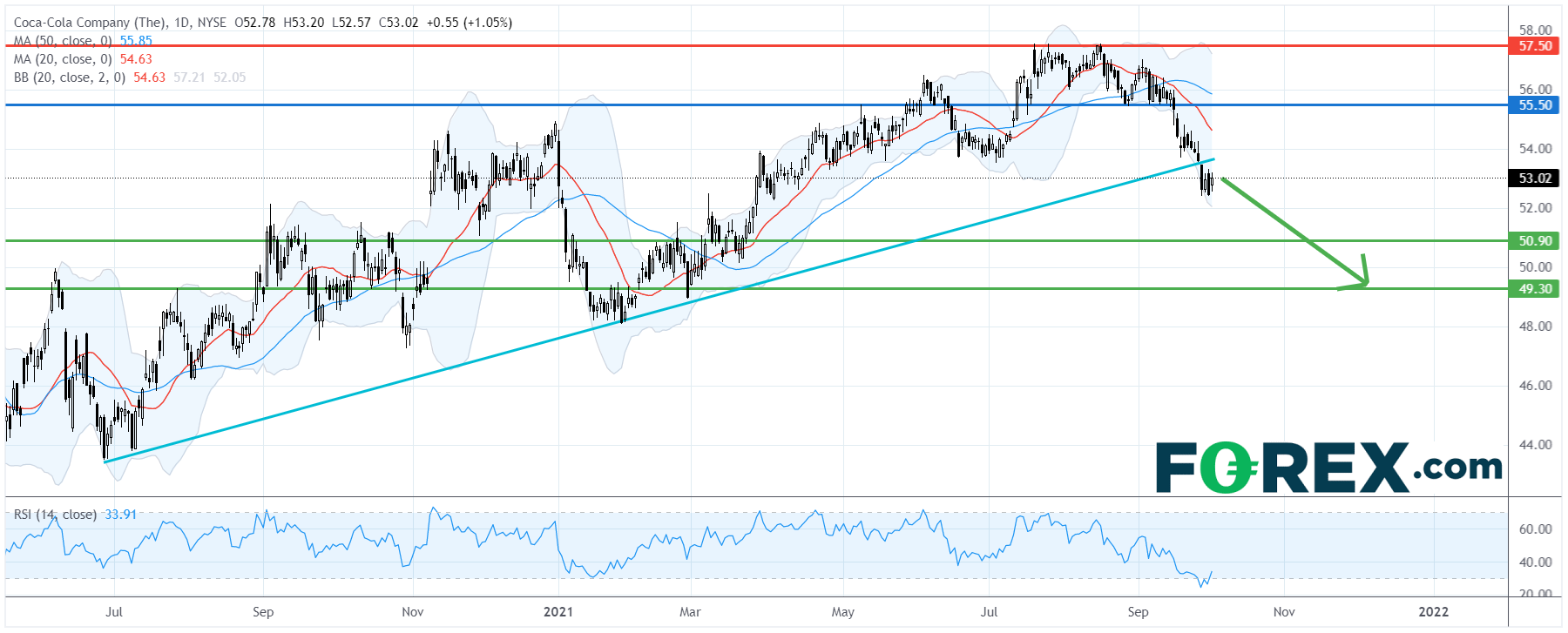 从技术角度看,如日线图所示,可口可乐股价的下行压力有所增强。它跌破了去年7月以来的上升趋势线,并进一步远20日及50日移动均线。
