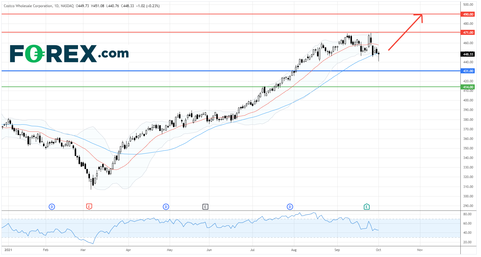 由于股价仍在52週高位附近交投,技术走势仍偏向完成整固后会再次带来升浪。只要股价能守在主要支持 (止损) 位431.00美元 (费波纳奇的回撤比率23.6%) 的上方,股价可上望471.00美元和490.00美元。