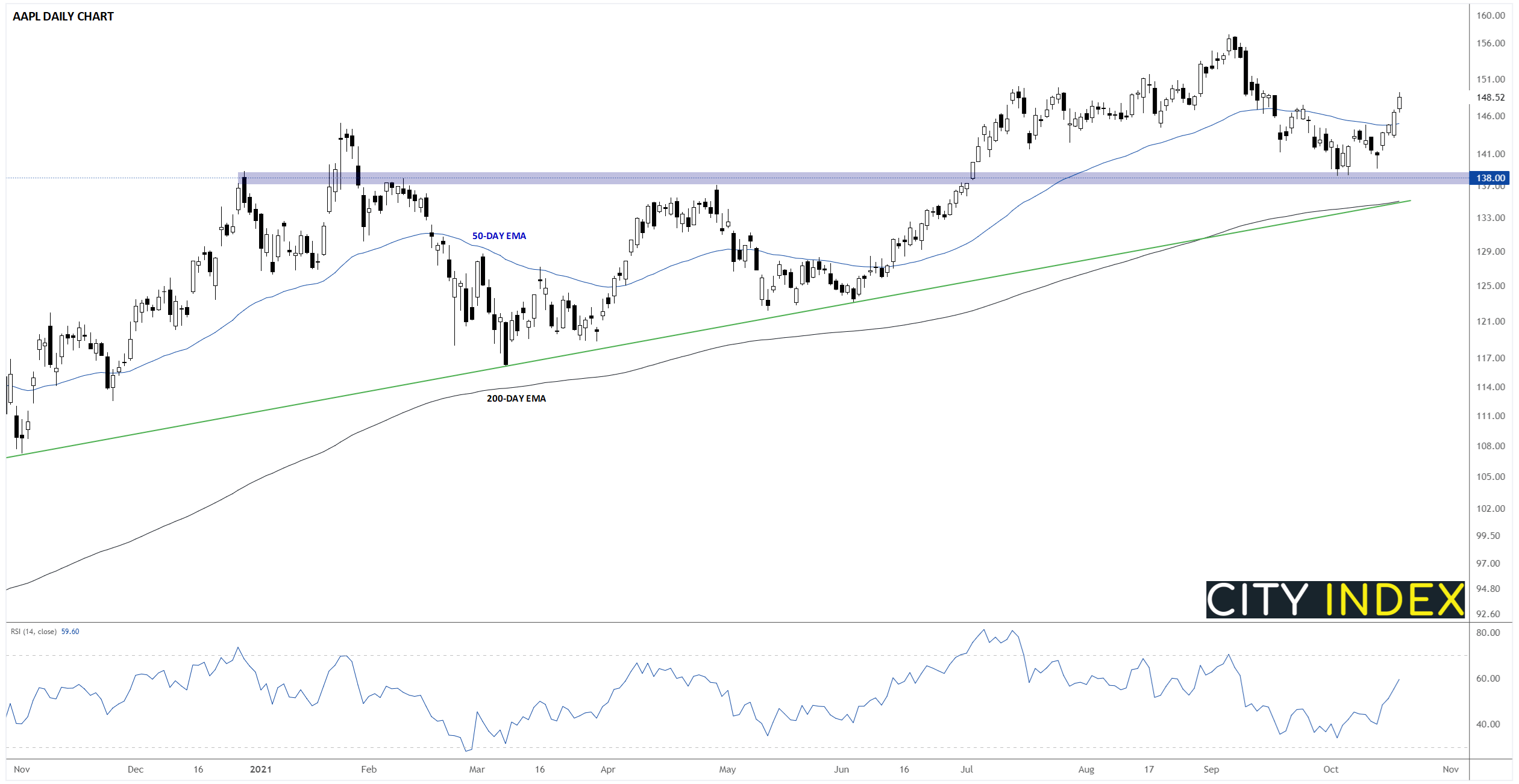 我们最后要讨论的是苹果公司,当然放在最后讨论并不是说它不重要。相反,该公司以超过2.4万亿美元的市值荣获全球最具价值上市公司的称号。苹果公司将在周四(10月28日)公布财报。纯粹从技术面看,股价目前下修11%,但从近期走势看,其较长期上涨趋势保持完好。展望后市,138区域这一前阻力现支撑位需要予以重点关注。只要守住该支撑,多头就可能感到安心,继而增仓并等待股价创下历史新高。
