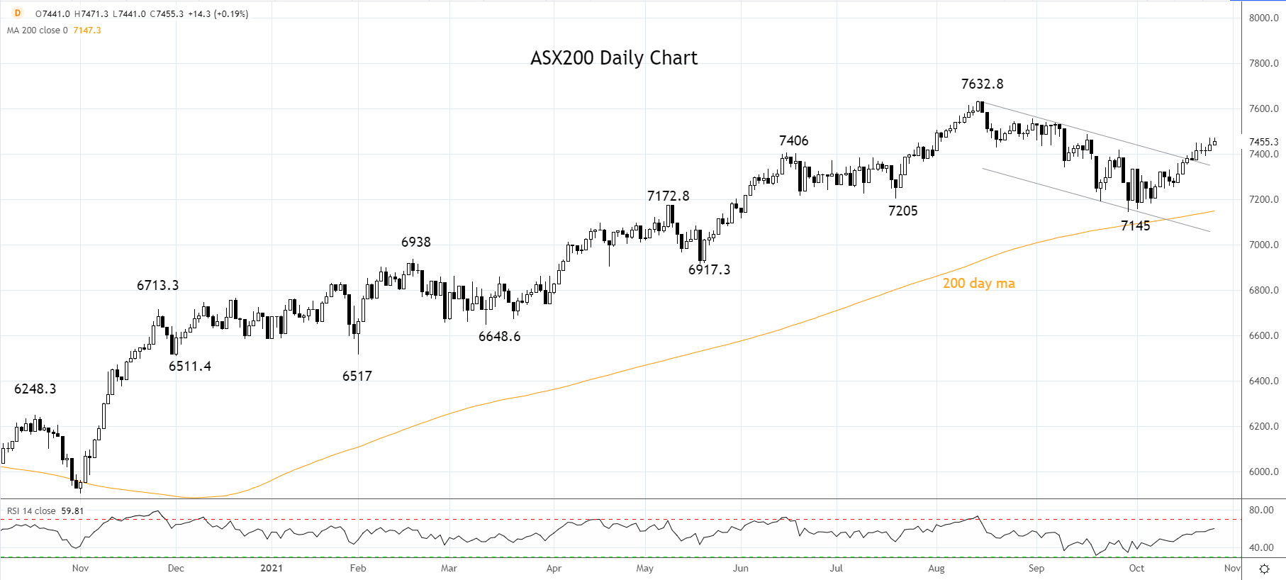 若ASX200指数未回落至7340/20短线支撑位下方,看涨成形,股指或寻求再次测试并突破8月高点7632.8,年底前有望逼近7750。