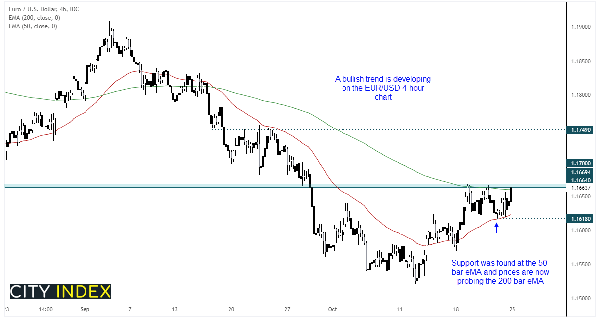 欧元/美元四小时图正在构筑看涨趋势。50天EMA均线近期为第二个低点抬高提供支撑,汇价现正试图站上200EMA均线。若IFO失利,汇价或应声推低,但鉴于已计入数据疲弱预期,即便落实,可能也不算大意外,所以,只要数据略优于预期,欧元就可能进一步走高。