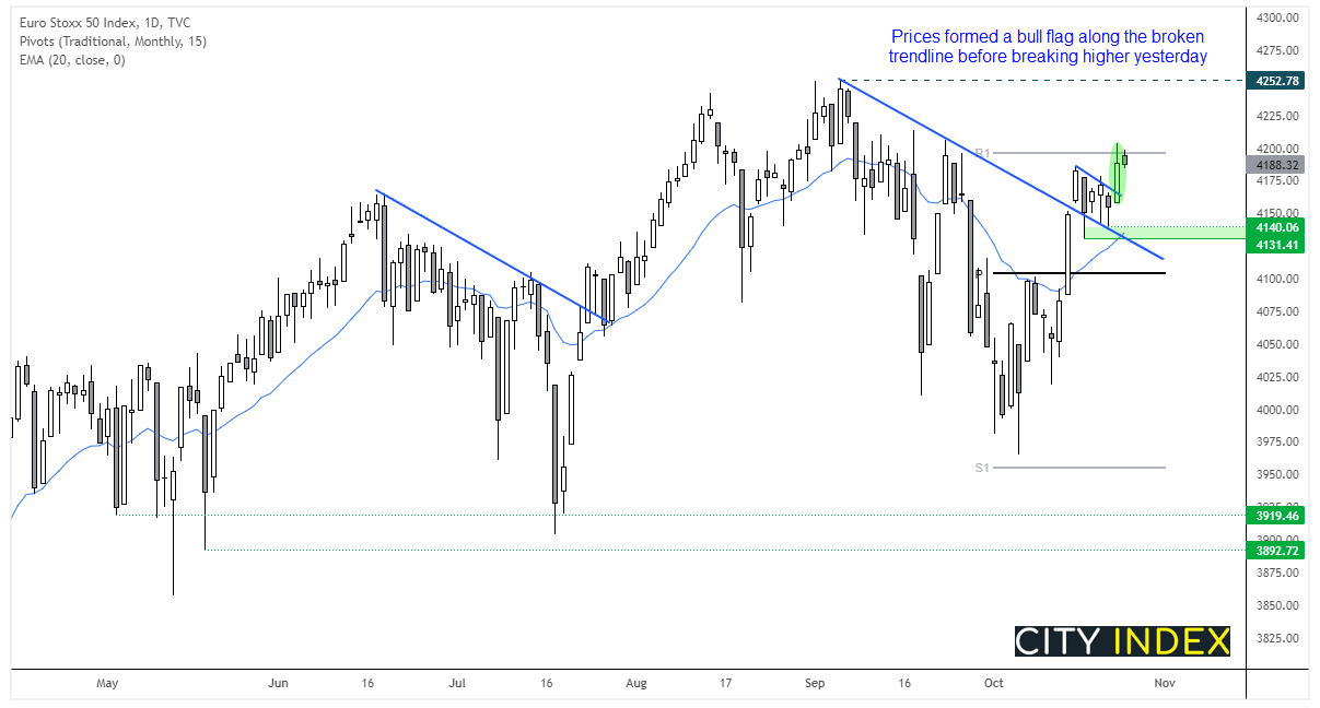 Euro Stoxx 50指数昨天突破持续看涨形态,继续跑赢DAX指数,随着多头势能积聚,DAX会追涨吗?