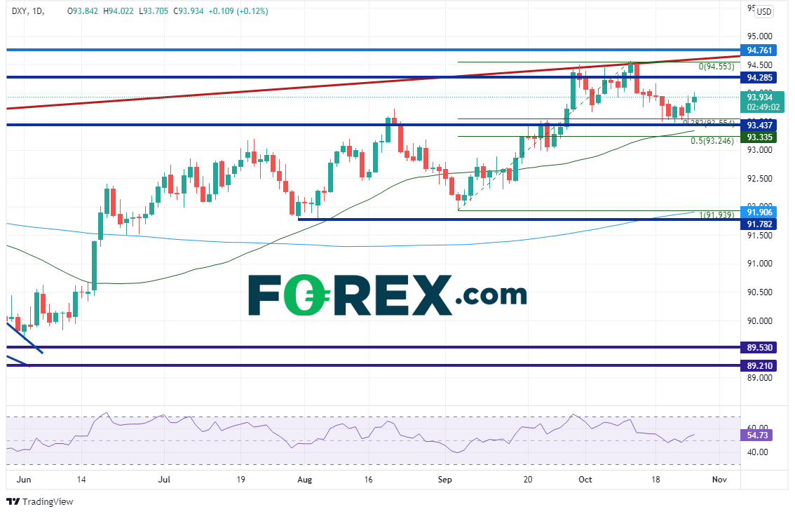 自从9月3日最低触及91.95后,美元指数大举冲高,但在10月12日止步于2011年以来的长期趋势线(红色线),即94.55附近,并且随后回撤。9月29日以来美元指数一直在93.36-94.56区间交投。上档有一个由10月12日高点、长期上斜趋势线、2020年9月高点以来水平阻力构成的阻力带,即94.55-94.76区间。支撑位在10月26日低点93.48、50天均线93.34和9月3日低点到10月12日高点行情的50%回档位93.25。