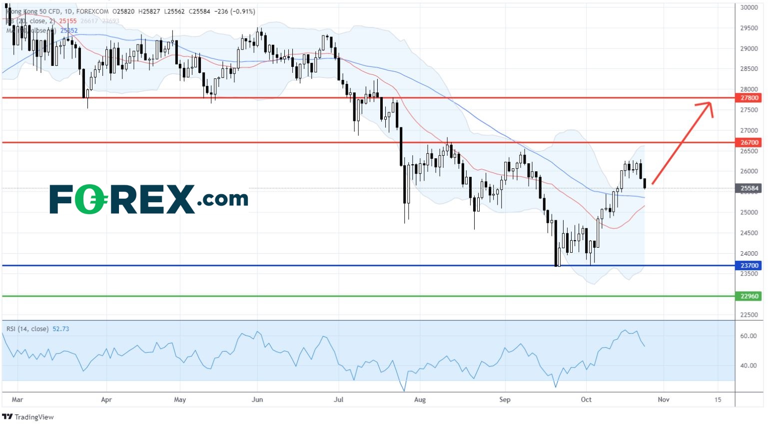 顶头阻力位在26,700点 (近布林带上线)。港股恒生指数 CFD曾分别在8月和9月尝试挑战此水平,均未能成功收盘在这水平之上。