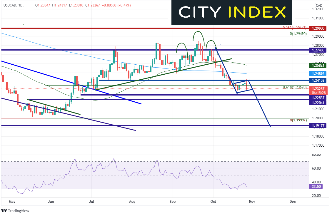 然而,尽管美元/加元大幅下跌,货币对仍未下破10月12日以来前低点1.2288。但价格走势确实在日线图构筑旗形,目标落在2015年5月低点1.1918附近支撑位。若今天收于1.2350下方,将形成看跌吞没K线,发出跌势持续信号。要达到目标,货币对必须首先下穿1.2254和1.2204水平支撑位。阻力位在旗形趋势线顶部、今天高点和水平阻力交汇点1.2415。下个阻力则位于1.2490附近200天均线。
