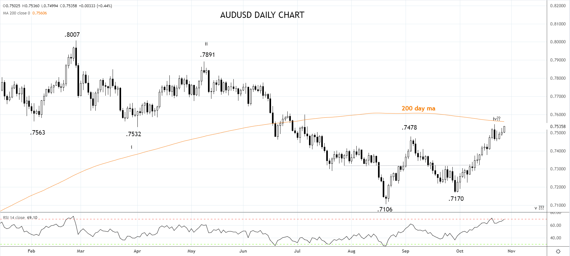 在收益率走高同时,澳元/美元截至撰写本文时已自0.7510反弹至0.7533,目标看向0.7550 /60重大阻力及等浪水平和200天均线。