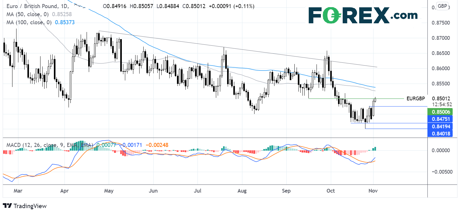 要上看50天均线0.8525、给予多头推高动力,则需要强力突破0.85阻力。