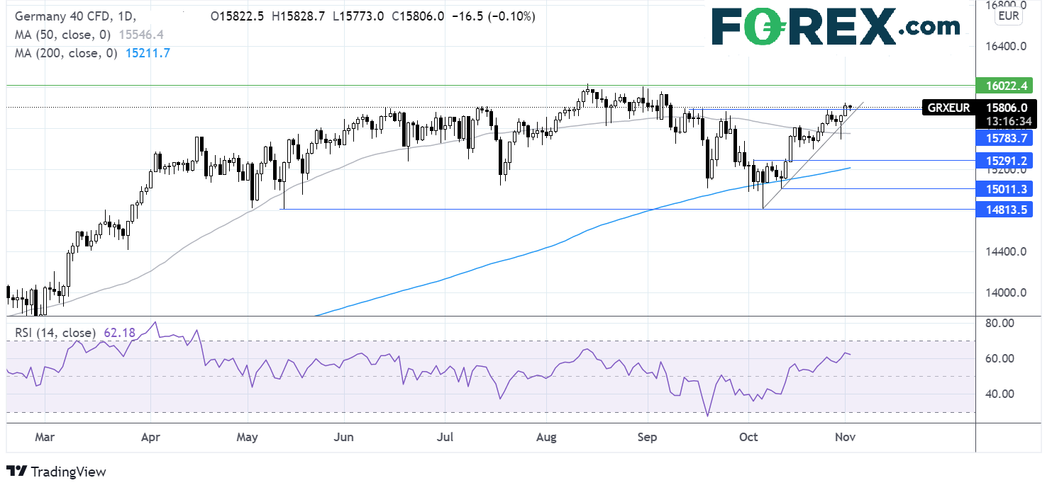 DAX从10月初低点14800继续反弹,目前交投于其50和200天均线以及持续数周的上升趋势线上方。