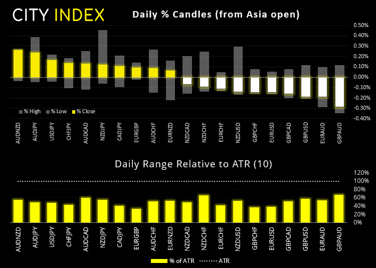 鉴于即将到来的欧洲数据和英央行会议日程,欧元/英镑成为今天波动性焦点。技术面来看,货币对正处在一个有趣的转折点上,于月图枢纽和200K均线(4小时图)下方的楔形形态内盘绕。因此,若欧洲数据整体疲弱而英央行大幅加息,货币对将重回下端趋势线。反之,强劲欧洲数据结合不加息/鸽派英央行将将带动货币对上穿阻力区域,符合其看涨趋势通道。对交易员来说,今天最糟糕的结果为欧洲数据喜忧参半,而英央行会议成果既符合预期,同时又发出令人困惑的讯息。