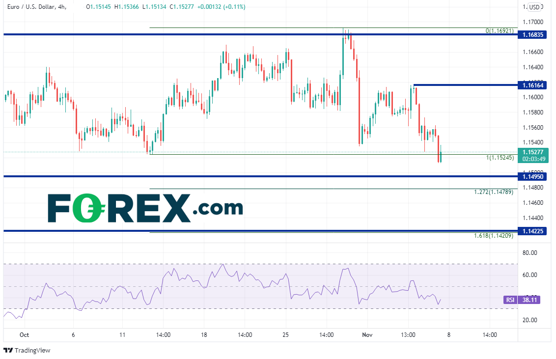 4小时图上1.1495下方的支撑位在10月12日低点到10月28日高点行情的127.2%扩展位,即1.1479附近,然后是同期行情的161.8%扩展位和2020年6月以来水平支撑位相汇处,即1.1421附近。短线阻力位在1.1616,接着是上述通道的下斜趋势线、50天均线和近期高点相汇而成的阻力带,即1.1675-1.1700区间。