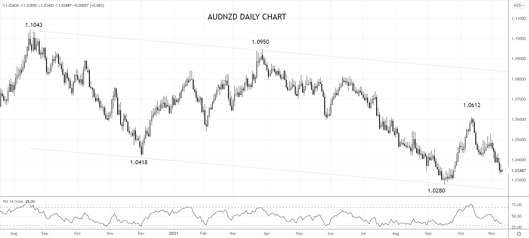 如果澳元/纽元仍收于1.0420/30下方,预期该交叉盘未来几周将继续下跌,跌向1.0250附近15个月趋势通道底部。