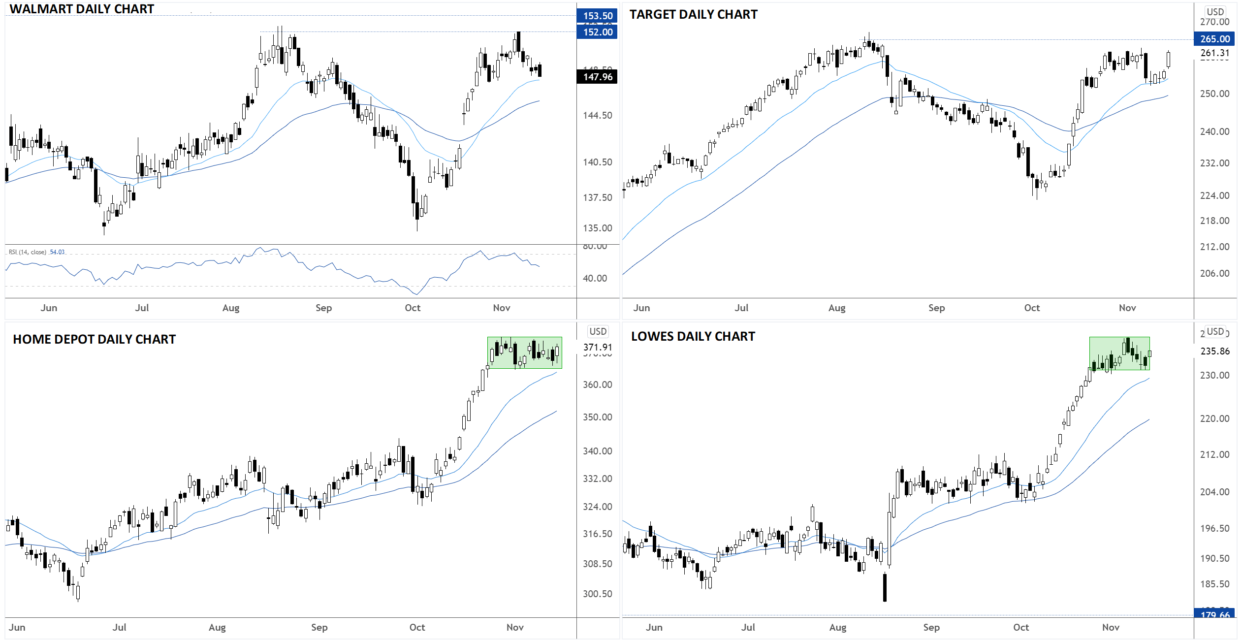 玉有瑕疵,但从宏观经济的角度看,过去几周以“央行周”的主题拉开11月的序幕,再慢慢过渡到通胀周的主题 – 再加上本周美国、英国和加拿大都将公布零售报告,而且Walmart、Target、Home Depot和Lowes也将发布财报,本周是当之无愧的“零售周”(……不过,通胀也将再度受到密切监测)