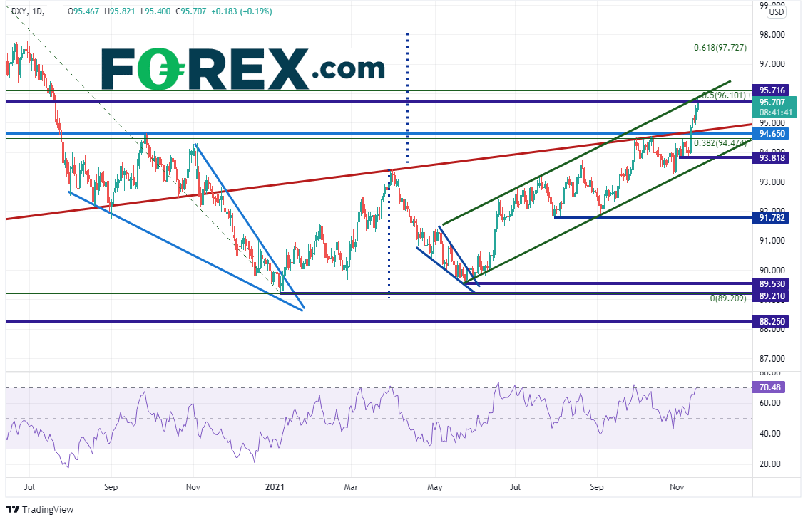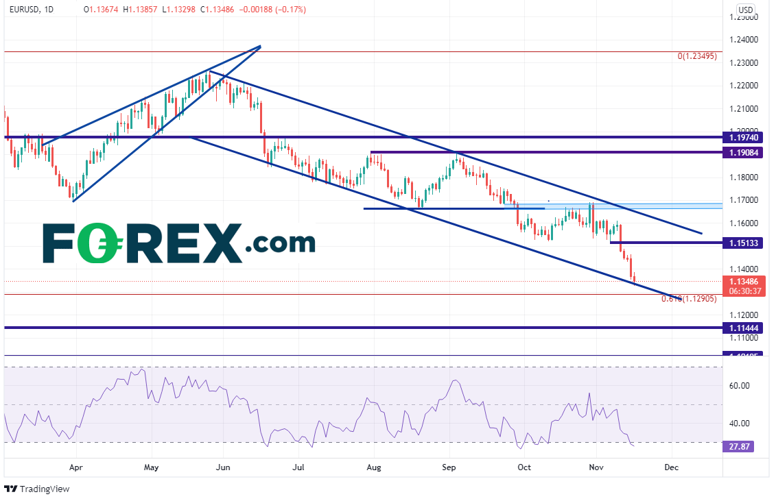 欧元/美元随着美元继续创下年内新高而继续形成年内新低,目前交投于下降通道的下轨趋势线附近,即1.1325一线。如果下破,下看2020年3月低点到2021年1月高点行情的61.8%回档位,即1.1290附近。欧元/美元也可能跌至2020年3月以来的水平支撑位1.1145附近。请注意,RSI眼下处于超卖区域,增加了价格反弹的可能性。上方阻力在11月5日低点引出的水平阻力位,即1.1513,然后是通道上轨趋势线1.1665附近。