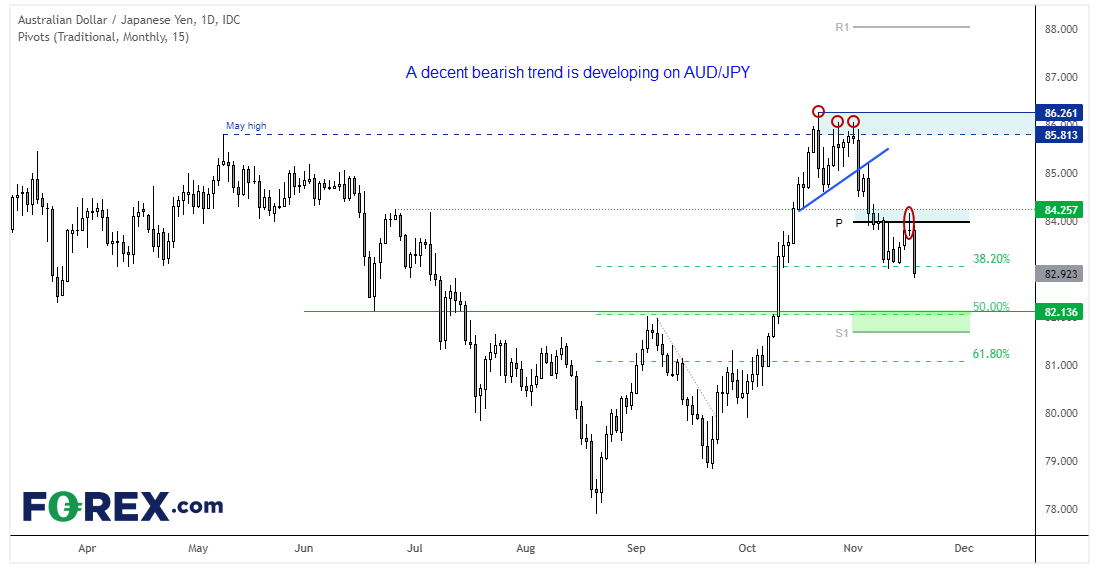 在我们追捧的日元货币对中,澳元/日元可能最受空头重视。在恒大危机造成最后一击致其回到5月高点下方并筑顶后,澳元/日元形成了不错的下跌趋势,于38.2%回档位企稳后回撤至月图枢轴点并形成看跌pinbar,下跌动能现已回归。我们怀疑下一站在82.13支撑位,并且会在昨天区间内或下破昨天区间低点后寻找看跌结构。
