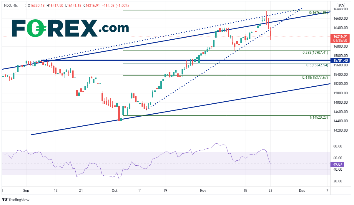 纳斯达克100指数过去两天在多方负面消息和多重阻力的综合作用下明显下挫,现在准备好重整旗鼓了吗?技术面或许还没准备好。那么,下个带动该股指大涨或大跌的催化剂是什么呢?也许是将在周三发布的美国PCE数据,也许是周四成交量稀少的交投环境,也或许是本周末将要出炉的“黑色星期五”销售数据。请留意该数据透露的、供应链中断导致多少商品“缺货”的信息。