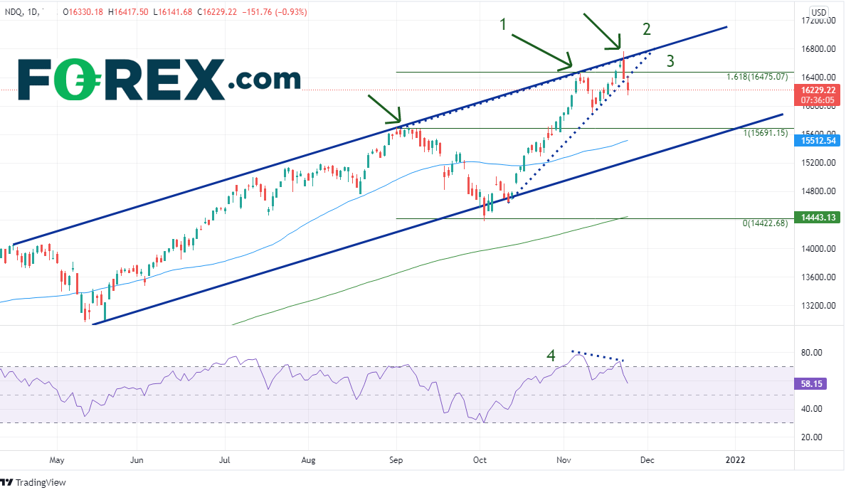 这些都是纳斯达克100指数周一盘中调头向下的有效基本面理由,但若深入研究日图图表我们就会发现,这波下跌似乎早在10月中旬就已开始酝酿。