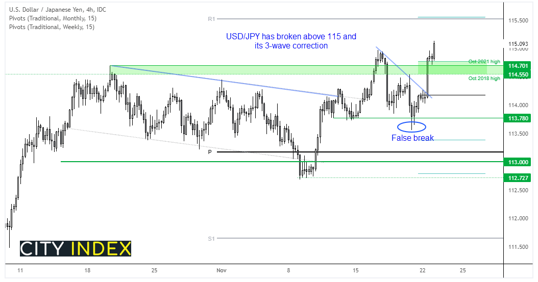 美元/日元跟随收益率上扬,最终在主导趋势带领下升穿115。11月10日,美元/日元于强劲美国通胀报告发布后,反弹至113上方,标志着三浪调整的结束,此后我们转向看涨。货币对上周自113以来的反弹势头于115淡出,并再次构筑三浪调整。但并未下穿113.78支撑位,此处很可能标志又一重要低点,目前动能已突破上行。请注意,支撑位在2021年10月高点和月图一号支撑枢纽,所以我们现在认为汇价将攻向115.50一线月图一号阻力和周图二号支撑枢纽位置。
