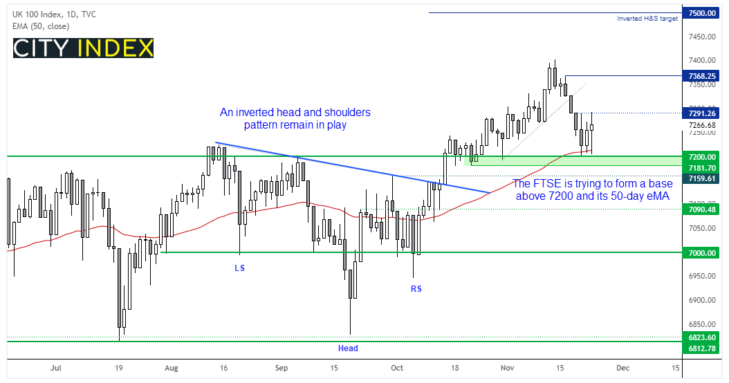 在从上周高点下跌2.6%之后,富时100指数企稳于7200和50天均线之上。看涨内包线以及随后的看涨外包线巩固7200附近支撑位,现在需要升穿7300才能确认低点已经到位。记住倒头肩形态仍在起效,预测目标在7500附近,只要价格守在7180-7200支撑区之上,我们就会寻找新的做多机会。