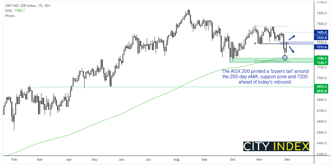 ASX 200看起来今天可能会有一个强劲收盘。周一跌势很快达成7200附近目标,于200天均线获撑后昨天收盘转升,构筑潜在尾盘买需。若价格今天开盘反弹并收于7300将为利好信号。