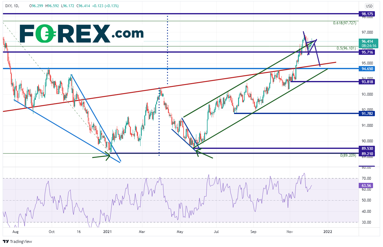 上述出人意料的数据公布后美元指数旋即自96.20附近摸至96.40。美元指数5月底在89.53附近向上突破一个下降楔形,此后一直有序上涨。11月19日,该指数站上96.10附近的通道上轨,后于11月26日回到通道内。在那之后,美元指数一直交投于95.70-96.50区间。阻力位在11月23日高点96.94,然后是2020年3月高点下跌至2021年1月低点行情的61.8%回档位97.73。水平阻力位兼双底形态的目标在98.17附近。当然,价格同样可能受下行动力的吸引。如果确实下跌,则支撑位在旗形下轨95.95附近。目标在2011年以来的长期上斜趋势线附近,即95.09一线。如果攻克,下看通道下轨趋势线兼水平支撑位94.65附近。