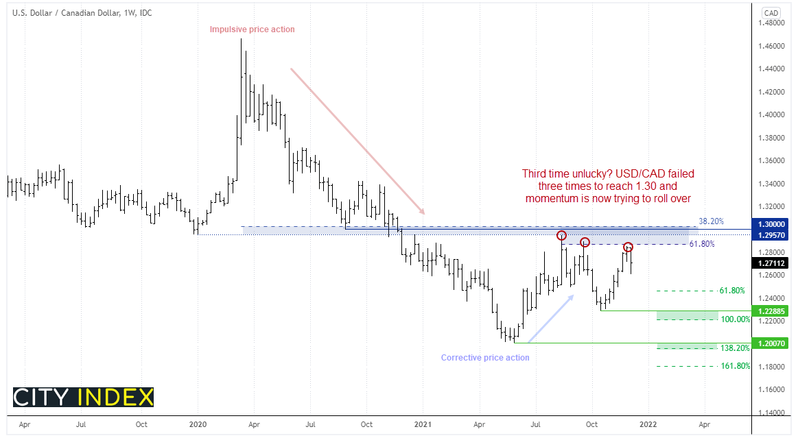 周线图上可以看到,货币对现有跌势始于2020年3月,之后汇价于今年回调并在1.30略下方反弹停滞。引起我们注意的是货币对三次再度测试1.30受挫,并在2021年高点下方形成两次高点降低。