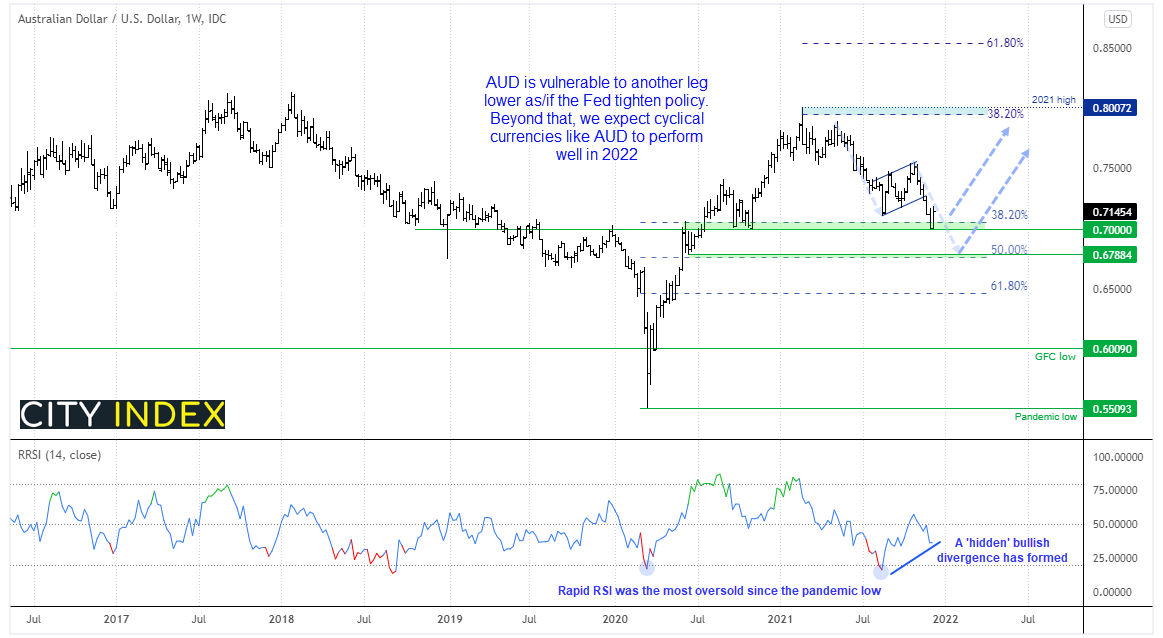 但周线图快速RSI(由艾略特波浪预测分析师Ian Copsey创建)显示,8月出现一个动量低点,且该指标自疫情低点以来从未超买。RSI还正在形成看涨背离,因此我们猜测回调时间有些过长了。如果明年年初成功守住0.70,我们会更确信这里就是真正的修正低点,从这里引出的38.2%投射位/0.8000区域2020年高点略下方为首个目标。