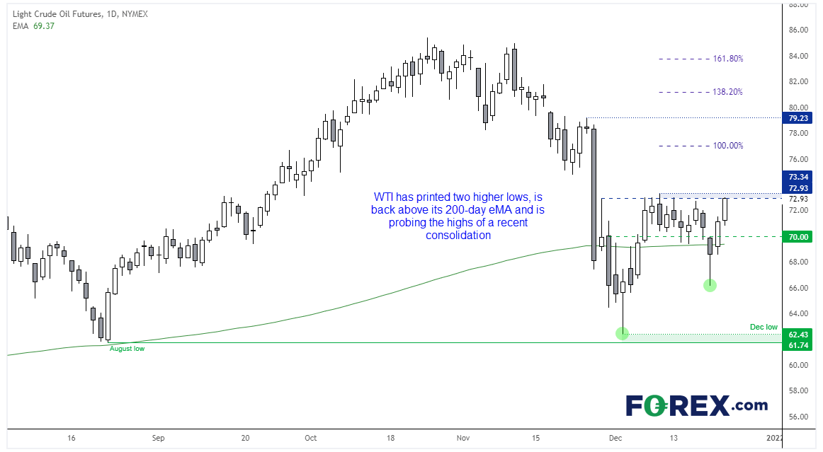 昨天发布的原油库存数据低于预期,油价得以连续第二天反弹。Omicron的威胁可能挥之不去,但新闻中也透露出一些乐观的信号。而鉴于市场的前瞻性特性,油价前景拥有了乐观基调。