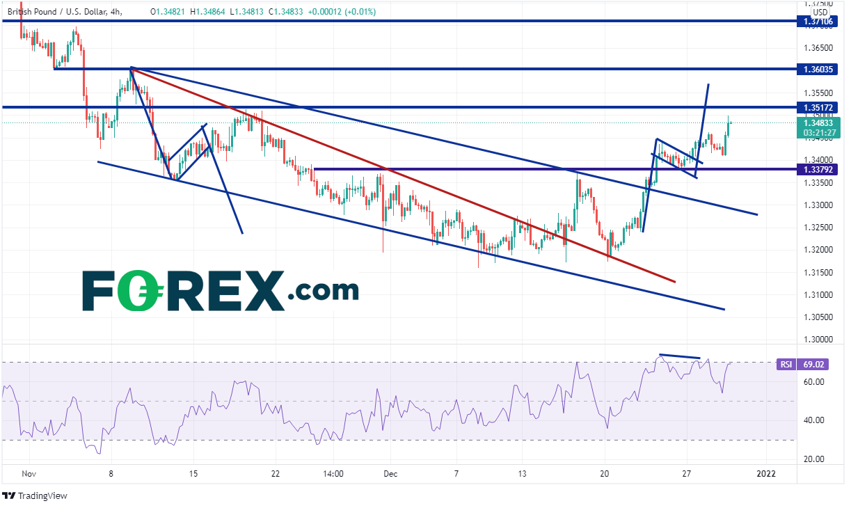 英镑/美元4小时图自11月9日以来不断下跌并形成下降楔形(请看红色线),一个月后在1.3225附近上破该楔形,探入水平阻力位后回调并回踩楔形上轨趋势。该货币对自12月20日开始走高且从未回首,由1.3183上涨至当前价位1.3499附近。上方第一个显而易见的阻力在1.3500。英镑/美元在本周初构建一个旗形,目标在1.3570附近,但在那之前还有一个“拦路虎”在水平阻力位1.3517。如果突破旗形目标,可能上看11月初高点兼楔形上轨1.3603附近。支撑位在周三低点1.3408附近、水平支撑位1.3379附近,然后是楔形上轨下降趋势线1.3290附近。