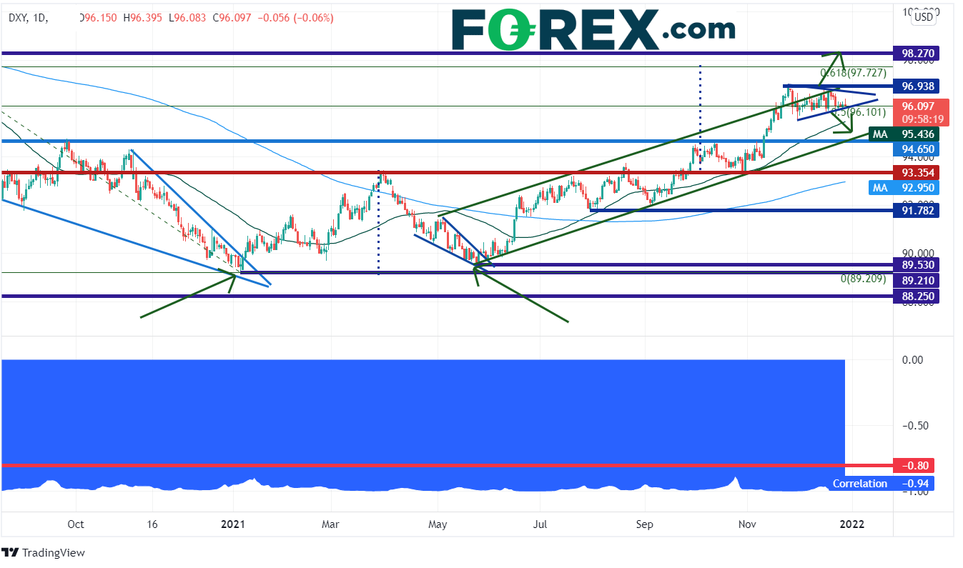 下图美元指数的底部就是美元指数和欧元/美元之间的相关系数,目前日图报在-0.94。这样的读数被视为强负相关,如果交易者希望进行买入美元指数的交易,沽出欧元/美元即可。