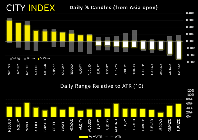 虽然英镑/美元延续令人印象深刻的涨势,但兑澳元和纽元并非如此。英镑/澳元和英镑/纽元均迎来强劲反弹,但已双双进入超买区域,目前动能转而推低。两者交投重回前周期高点下方,修正展开,从而为交易员提供了反趋势交易或观望等待支撑构筑并重回日线图主导看涨趋势的选择。