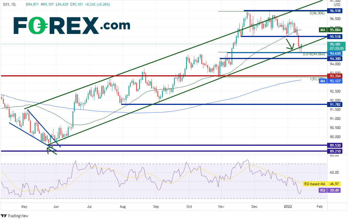 这应该利多美元指数。美元指数已回到2021年5月以来的长期上升通道的下轨趋势线上方,上档阻力有水平阻力位95.52、50天均线95.88。美元指数目前守住2021年10月28日低点到11月24日高点行情的61.8%回档位,即94.66附近,但若下破,可能跌至水平支撑位94.30和93.35。