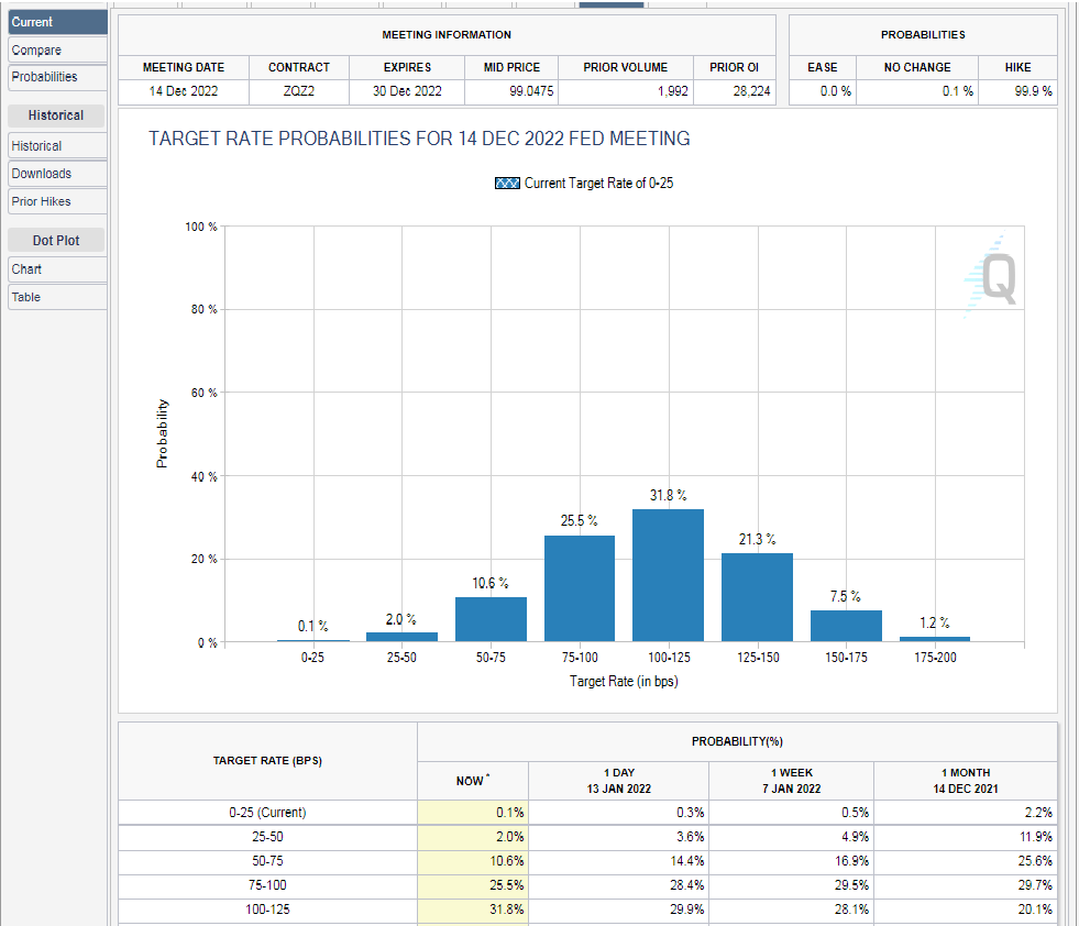 CME FedWatch Tool显示,市场目前因此计入2022年加息4次的前景: