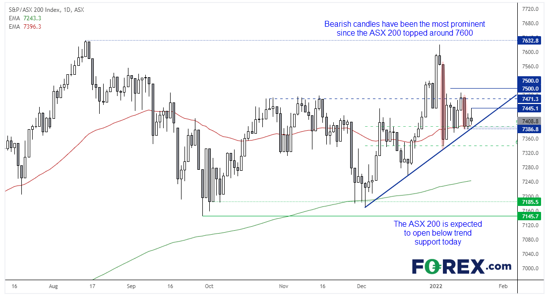 美国现货市场和亚洲股市的下跌可能拖累ASX 200指数。ASX 200指数期货市场目前暗示ASX 200指数开盘报在7350附近(但对此一定要小心看待),也可能跌破趋势线支撑。如果跌破,7350可能成为依然维持短线看跌观点的空头逢高沽出的重要参考位。自7600附近见顶以来的下跌势头之猛表明价格趋于下破,现在需要延续这样的动能。