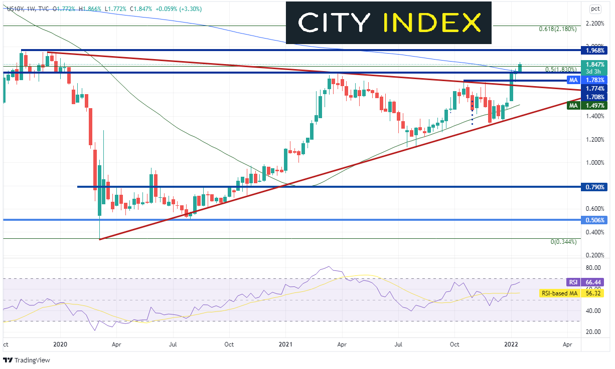 周线图上,下个阻力水平一直要上看2019年11月4日高点1.968%,然后是重要整数位2%。支撑重回200周均线和上文提到的2021年高点。
