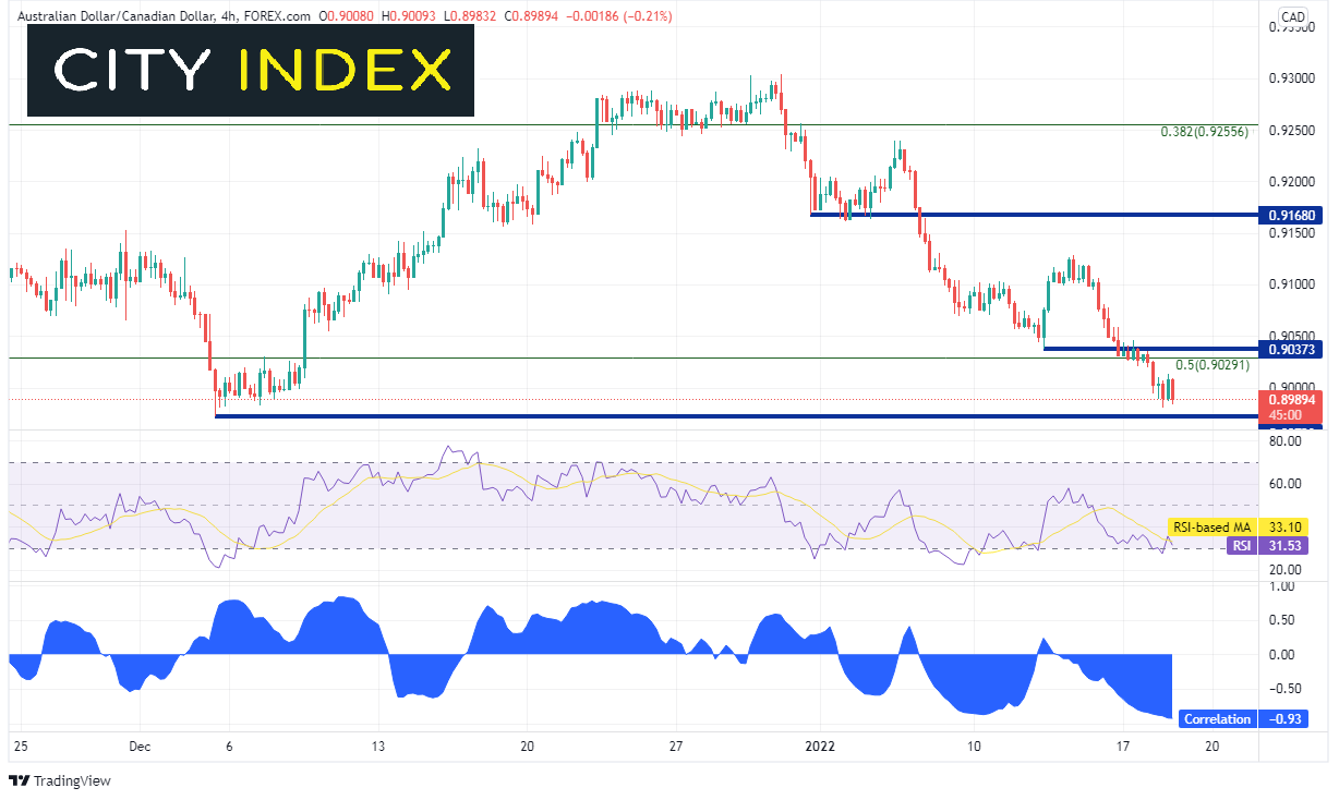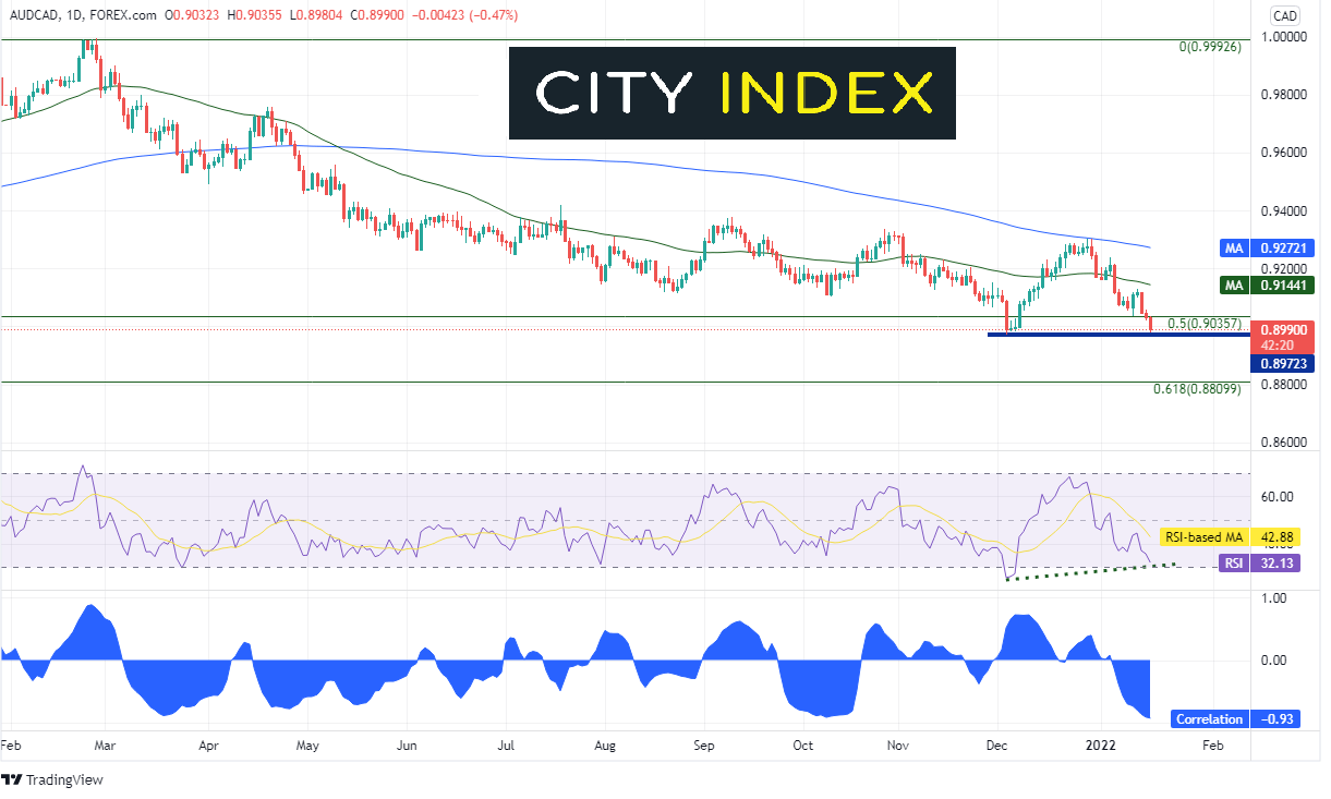 这和澳元/加元有什么关系?日线图上,澳元/加元目前与10年期美债收益率呈强烈负相关。当前相关系数-0.93。相关系数高于+0.80或低于-0.80则视为两种资产之间存在强相关性。-1.00则指向完全负相关,意味着两种资产所有时候都呈反向走势。-0.93已经非常接近这个读数了! 10年期美债收益率突破2020年2月低点至2021年1月高点上行之50%回档位,澳元/加元也同时下穿2020年2月高点至2021年2月低点下行之50%回档位。此外,货币对目前距2021年12月低点仅数点之遥。但请注意,RSI正与汇价走势构筑背离,表明货币对可能做好了反弹准备。澳元/加元会继续推低吗?
