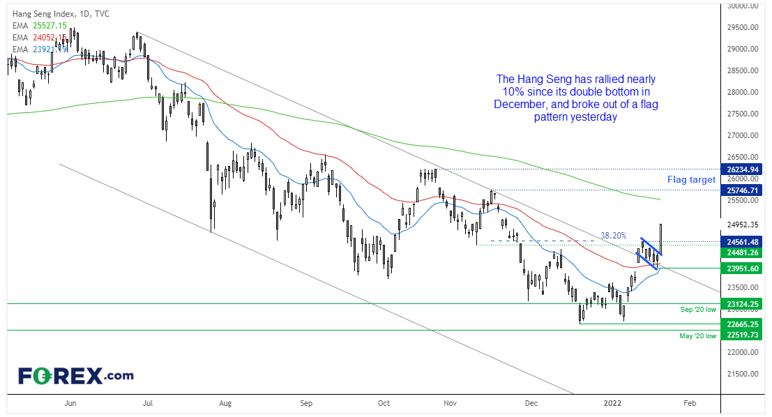恒生指数在昨天突破之前沿着趋势线连续回撤五个交易时段并形成旗形形态,该形态突破后的测量目标大致位于26,000。守住23,950低点我们继续看涨,但要使旗形突破行情成立,价格不应回到24500高点下方。不过,只要守住23,950,日图还是趋于上行。