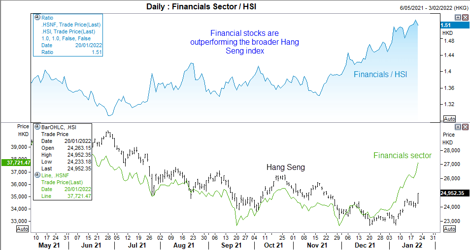 恒生指数昨天反弹逾3%,斩获18个月最大单日涨幅并收于2个月高点, 是当天亚洲市场表现最优异的股指,而且看起来还有上行空间。恒生指数对中国人民银行最新一轮宽松银根的举措的反应不可谓不惊艳。过去两个月里金融板块始终耀眼夺目,从在11月触底后一路回升的金融板块/恒生指数比率可见一斑。但截至昨天收盘,四大超级板块中上涨的唯有工商业板块。所以,我们将密切关注前述比率,观察过去表现逊色的板块是否脱颖而出。
