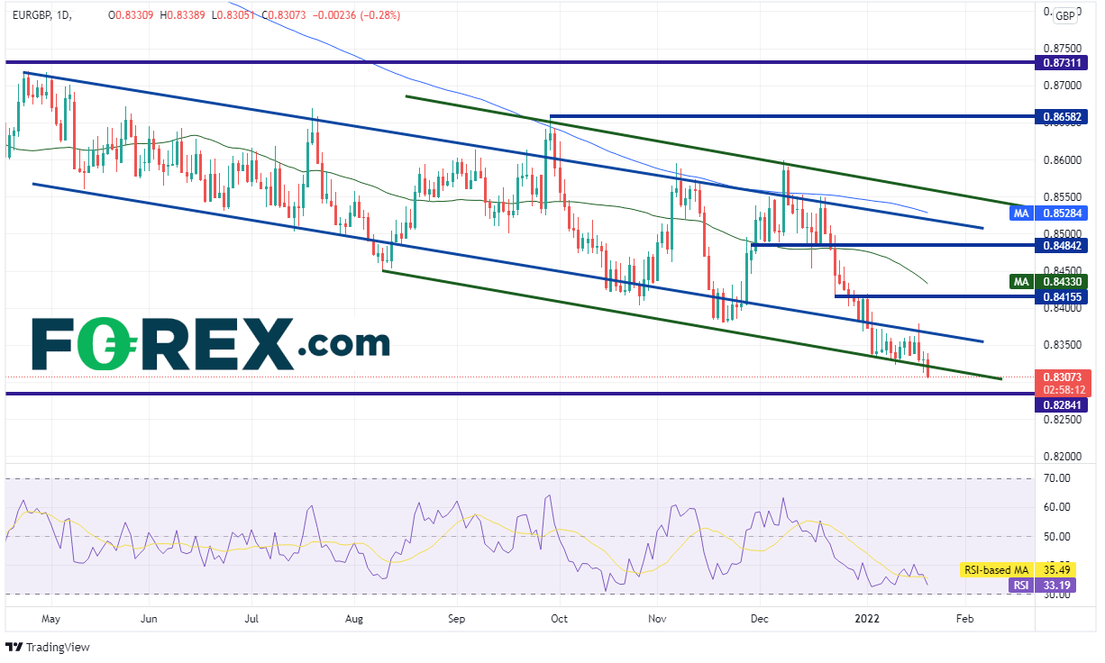 这对欧元兑那些央行加息的货币的走势有什么影响?通常的结论是欧元兑这些货币将下跌,欧元/英镑也确实自2021年4月以来一直处于一个长期下降通道内。但该货币对在2021年8月的走势更加反复,开始在通道内“上窜下跳”继而形成一个更宽广的通道(请看绿色线)。欧元/英镑周四因拉加德评论和欧洲央行会议记录的刺激而打破绿色通道,跌至2020年2月以来最低点。