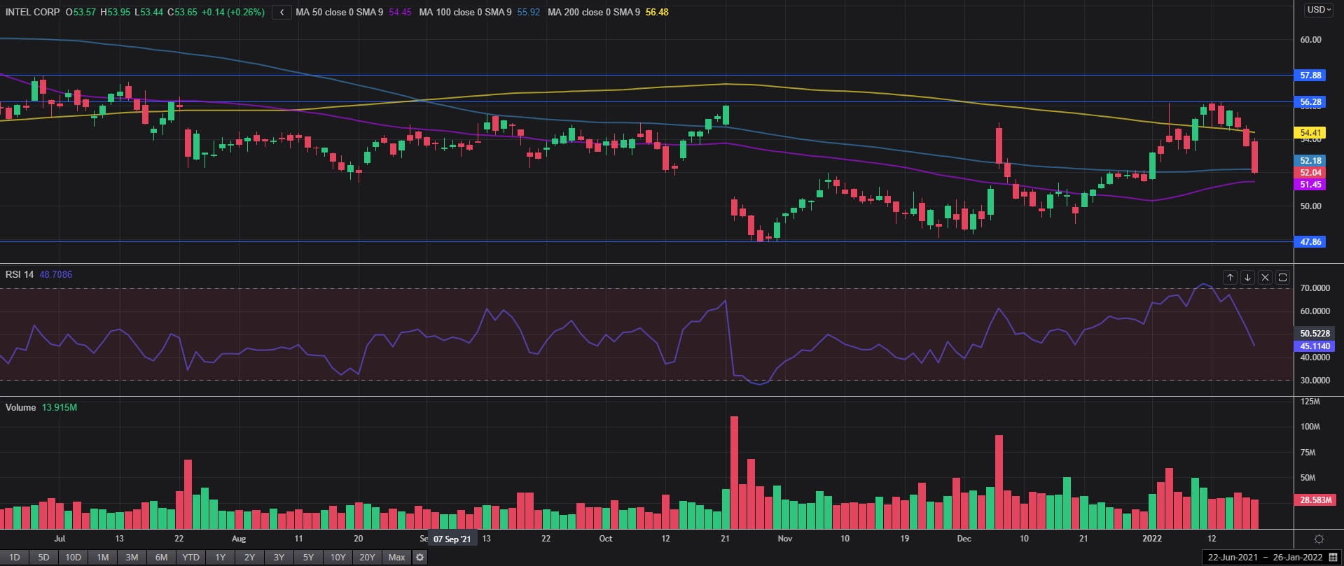 英特尔股价自12月中旬以来一直显露走高迹象,但自上周触及56美元上限后已开始推低。