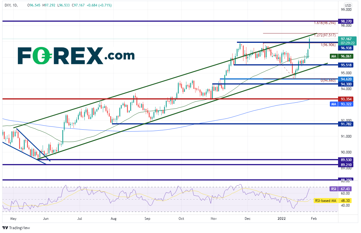 受鲍威尔昨天在新闻发布会上的强硬评论影响,美元指数上涨。自从下破2021年5月以来上斜通道的下轨趋势线失败,美元指数就不断迎来买盘。美元指数今天站上前高点96.90并挑战前述通道上轨趋势线所在的97.30附近构成的阻力,下个阻力位在2021年12月15日高点到2021年1月13日低点行情的127.2%扩展位,即97.52附近。然后上看由同期行情的161.8%扩展位和2020年春季以来水平阻力位组成的阻力,即98.28附近。支撑位在突破位96.90、今天低点下方的跳空缺口96.48、50天均线96.06附近。