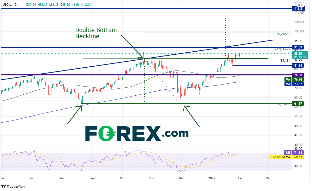 西得州原油于2021年8月在61.87形成低点后反弹至85.39,之后再度下跌并于12月2日回踩8月低点。油价随后再度反弹,于1月18日突破前高点85.39,构筑双底形态。该形态突破后的目标在颈线突破位加上底部到颈线的高度,此例中在108.30附近。但沿途首先必须清除91.59附近的障碍,其由2013/2014前低点和2021年10月25日高点到12月2日低点行情的127.2%扩展位组成。一根上斜趋势线就交叉于其上的92.50附近。下个阻力在前述行情的161.8%扩展位99.56附近。支撑位在颈线下方的近期低点81.94,然后是前阻力及50天均线76.76/76.78附近,接着是200天均线73.32。