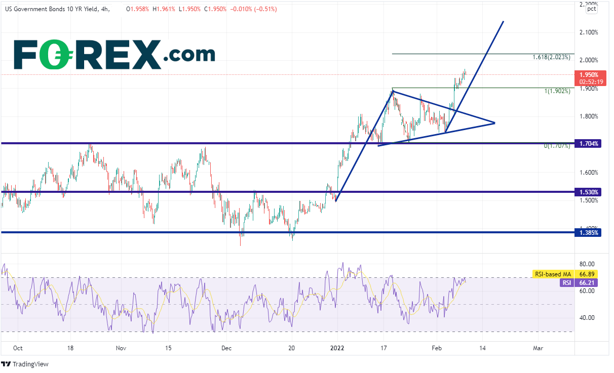 10年期美债收益率4小时图在2月3日打破三角旗形态后不断上涨,该形态的目标为突破位加上三角旗旗杆长度,本例中在2.14%附近。但在到达该目标之前还有多个绊脚石,包括2%的心理整数关口、1月19日高点到1月24日低点行情的161.8%扩展位,即2.023%附近。第一支撑位在1月19日高点1.902%附近,然后是1.743% - 1.80%支撑区间,落在三角旗尖端附近,接着是1月19日低点1.694%。