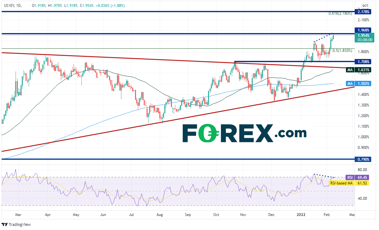 在利率上升的担心作用之下,债券收益率走高。美国10年期基准债券收益率周二最高摸至1.97%,创下2019年7月以来最高点,只比2%的心理整数关口低几个基点。请注意,RSI正与收益率背离,可能暗示收益率在重拾更大的上涨趋势之前先行回调。