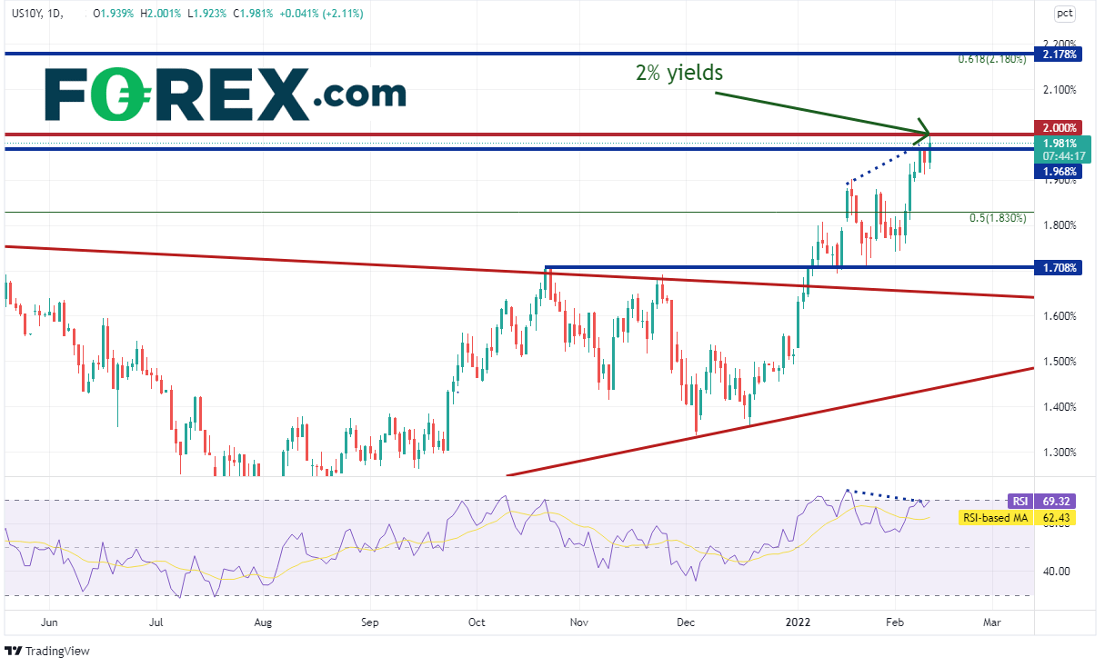 数据发布后,股市和债市闻讯下跌而美元应声上涨。美国10年期债券收益率升至2.00%的心理整数关口,创下2019年8月以来最高点。