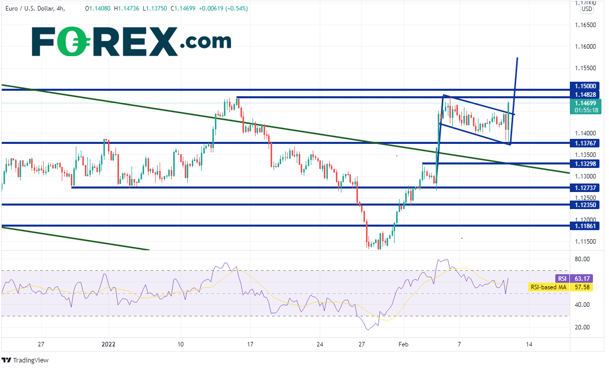 如上所述,美元在CPI数据发布后应声上涨,欧元/美元因此下跌。该货币对4小时图自从假性下破2021年11月24日前低点(最低触及1.1121)以来一直在走高。但受立场从之前的温和转变为略微强硬的欧洲央行的影响,欧元/美元于2月3日大举上攻,创下近期高点1.1484,上方为长期阻力位1.1490/1.1500。该货币对之后回撤并形成旗形形态,今天触及水平支撑位与旗形下轨趋势线所在的1.1376。