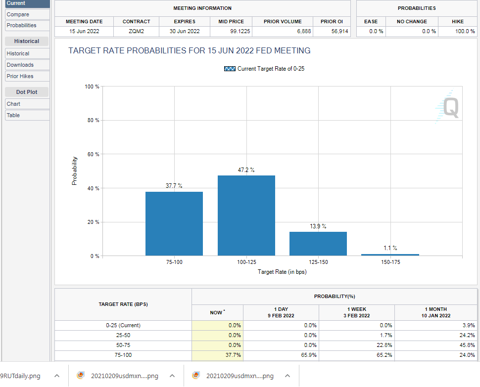 美国1月CPI年率报在7.5%,高于7.3%的预期值和7.0%的前值,创下1982年2月以来最高点。剔除不稳定的食品与能源的价格的核心通胀率上涨6%,高于5.9%的预期值和5.5%的前值。CME Fedwatch工具显示,市场现在计入3月加息50个基点的几率几乎达到50%。在该数据披露之前,这个数字为33%。另外,市场现在计入6月15日会议加息100个基点的前景。
